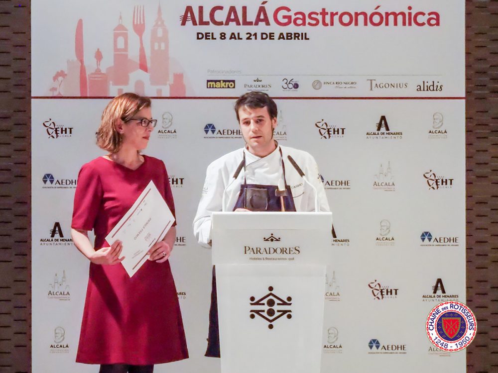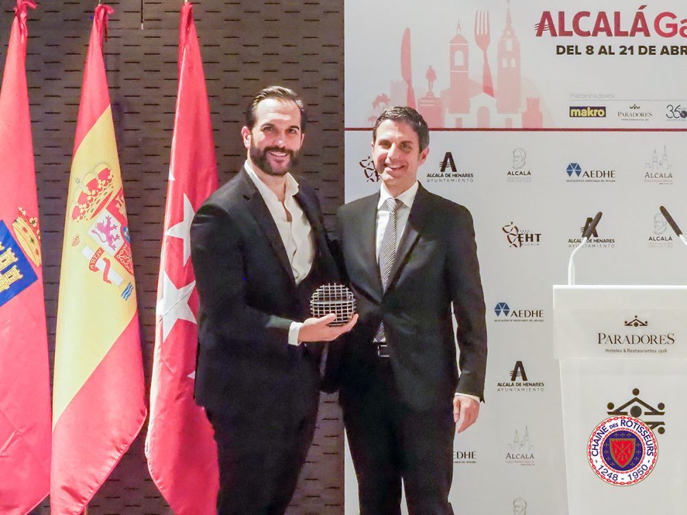 D. José Valdearcos, director de Alimentos y Bebidas del Parador de Alcalá de Henares y presidente de Alcalá Gastronómica, entregó un reconocimiento a D. Miguel Ángel del Corral, director de la Escuela de Hostelería y Turismo de Alcalá de Henares, por los 25 años de trayectoria de la Escuela y la gran labor que se está desarrollando desde esta escuela en la formación de los futuros profesionales del sector.
