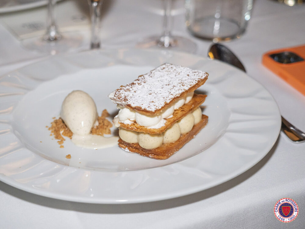 Y la parte dulce consistió en un postre de milhojas de vainilla de Tahití, hojaldre caramelizado, crema y helado de vainilla que hizo las delicias de los más golosos, armonizado con Cava Reserva Familiar Barón Merten 2011, de Jaume Giró i Giró, con mucho cuerpo, sereno, profundo y aromas de larga crianza, muy agradable en boca.