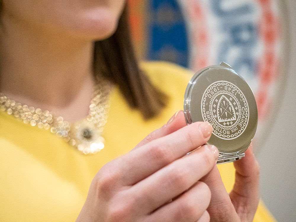 Con el postre y los cafés vinieron los regalos. Para las señoras un espejo de bolso serigrafiado con el logo de la Chaîne des Rôtisseurs que fue muy bien recibido, y para los caballeros una botella de Trenel Brut Crémant de Bourgogne.